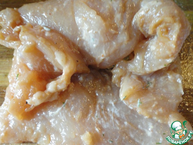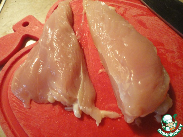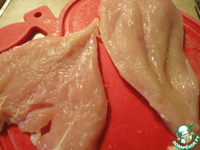 Потом большое филе разрезаю пополам, не дорезая до конца и разворачиваю. Точно также надрезаю край большого филе, который остался на малом. Надеюсь объяснила понятно.