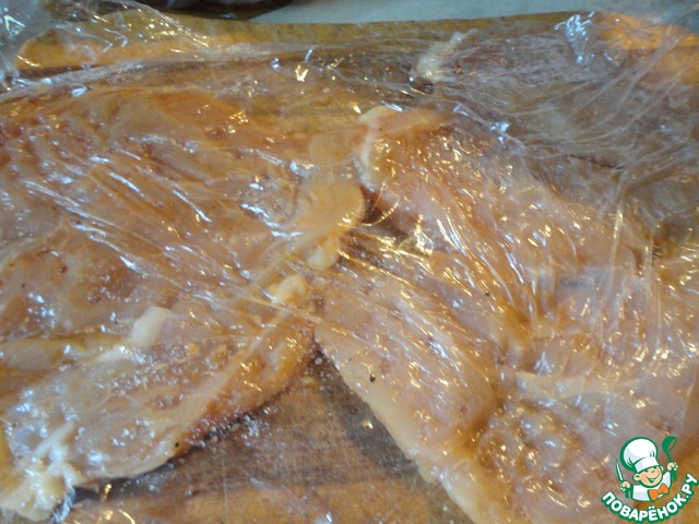 Курицу отбиваем через пленку без фанатизма. Нужно быть аккуратными, чтобы в филе не образовалось дырок.