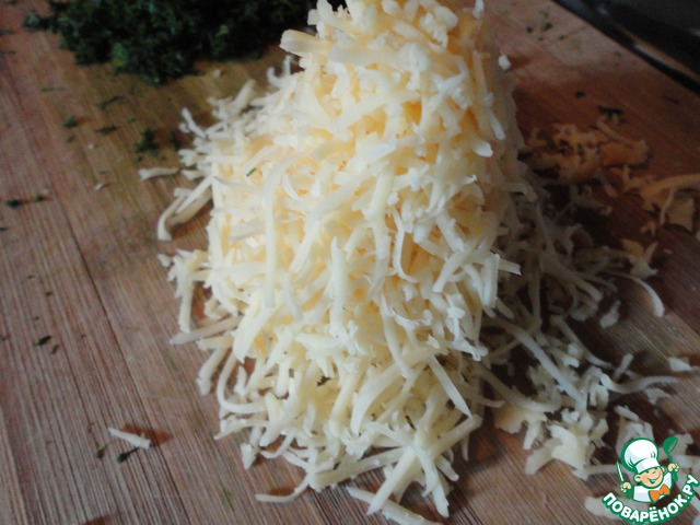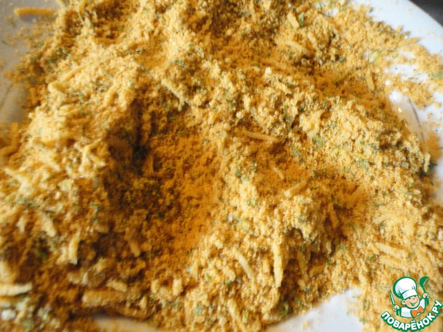 Добавляем сыр и одну половину зелени к панировочным сухарям, также добавляем щепотку соли, неного черного и красного перца и хорошо перетираем все пальцами. Если готовите для детей - перец не добавляем.
