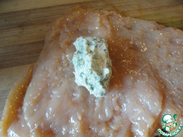 Начинаем заворачивать. Накрыть масло пластом курицы, подвернуть боковые края и заворачивать дальше.