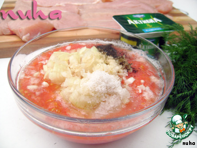 Помидоры очистить от кожицы, натереть на тёрке или пюрировать с помощью блендера. Добавить в томатное пюре измельчённый лук, выдавленный через пресс чеснок, соль, перец.