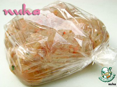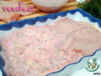 Выложить в глубокую форму куриное мясо, заливая подготовленным маринадом: два филе, маринад, ещё два филе и оставшийся маринад.
