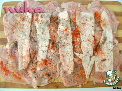 После того, как филе промариновалось, выложим его в форме двух одинаковых прямоугольников. Сало порежем тонкими полосками, выложим на наше мясо. Посыпем специями: перцем, паприкой, мускатным орехом и кумином. Специи обязательно и желательно именно такие!