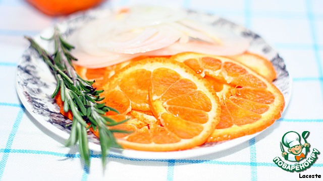 Лук и мандарин (1шт.) нарезать тонкими кольцами.