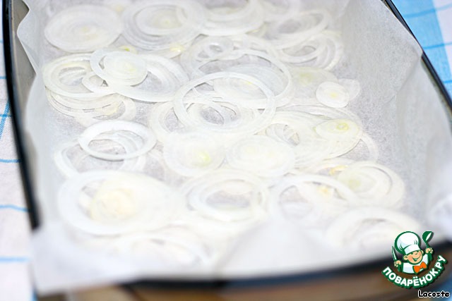 Огнеупорную форму застелить пергаментом. Выложить слой лука.