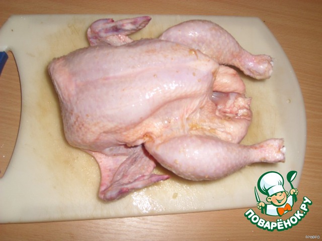 Курицу моем,натираем смесью из соли+ раздавленного чеснока+ красного молотого перца...