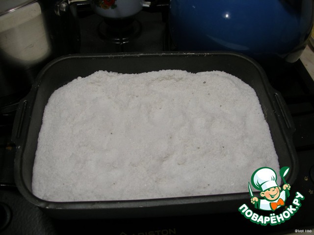 В форму для запекания высыпать соль слоем в 3-4 см.