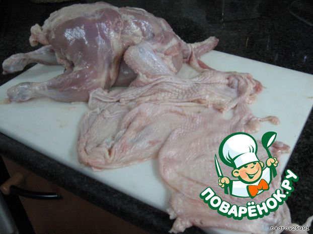 Птицу раздеть, стараясь не попортить одeжку, она нам понадобится.