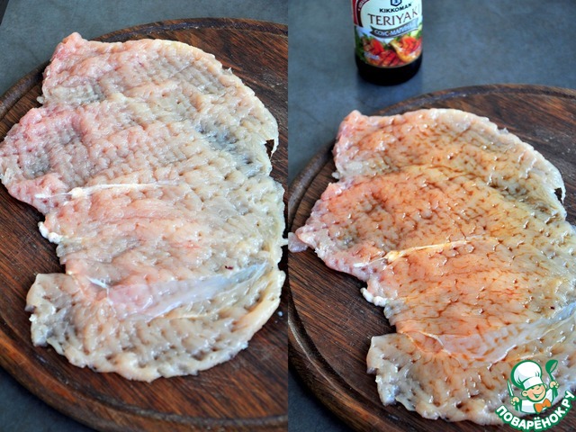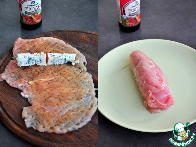 Половину куриного филе тонко разрезать, накрыть пищевой пленкой, хорошо отбить. Смазать соусом терияки. Оставить минуты на 3 мариноваться. Поперчить. Использовать ли соль, решать вам, сыр, бекон и тарияки достаточно соленые сами по себе.