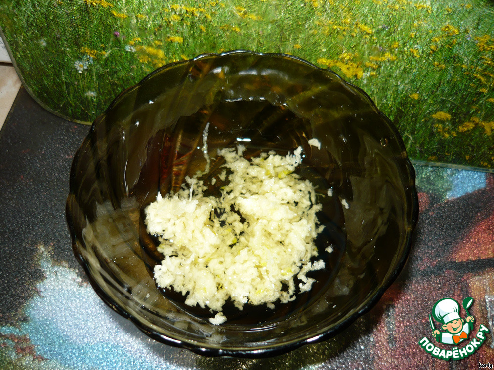 Готовим верхнюю заливку. Чеснок измельчить или пропустить через чеснокодавилку. Добавить масло, воду и соль.