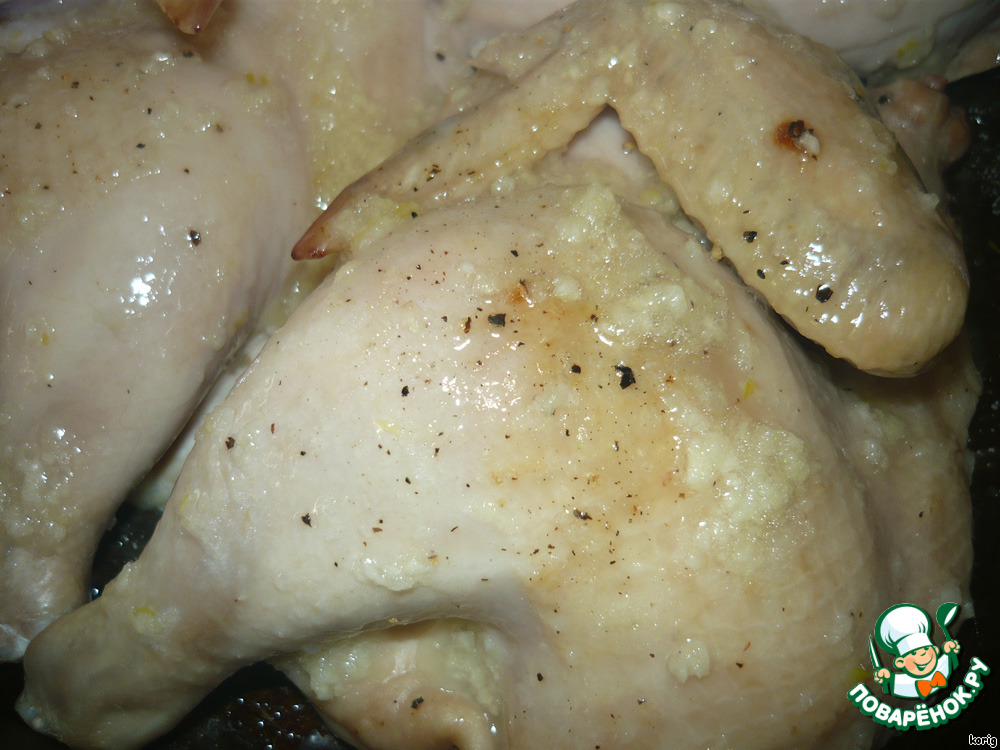 Обмазать кисточкой (так написано) куски птицы. Но думаю, если смесь выкладывать ложечкой, вкус не изменится. Возвращаем птицу в духовку. Периодически вынимаем, смазываем образовавшимся маринадом.