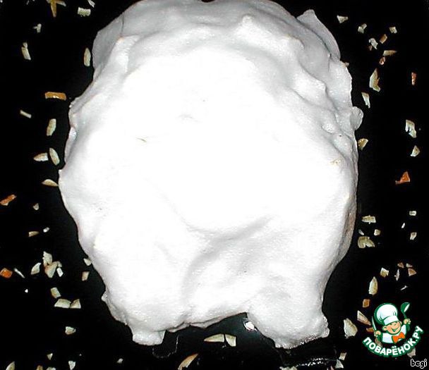 На запеченную курицу выложить белковую массу и подержать немного в духовке (при 200 гр. 2 мин).