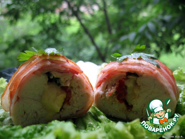 Вкладывать в кармашки брусок сыра, 2 листика петрушки, 1 черри и закрывать все вторым бруском сыра. Запеленать готовый полуфабрикат 2-мя полосками бекона и закрепить его зубочистками.