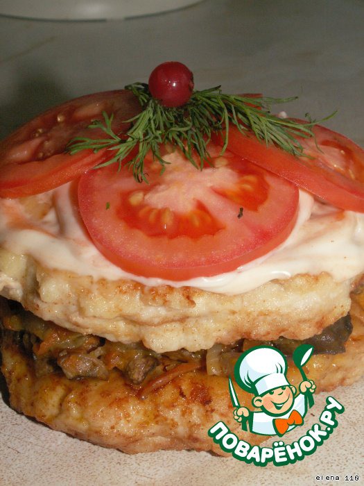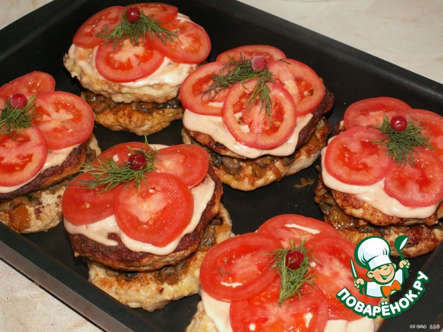 Кладeм одну котлетку, на неe выкладываем (не жалея) овоще-грибную смесь, сверху на смесь кладeм 1 ч. л. соуса. Накрываем другой котлеткой. Сверху смазываем соусом и кладeм помидоры.