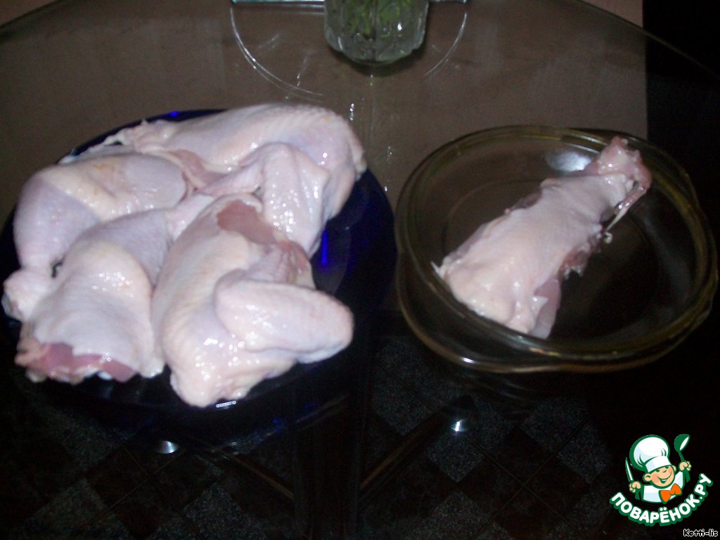 Отрезаем острым ножом две ножки. Затем надрезаем грудку вдоль пополам и отделяем два филе вместе с крылышками. Должно получится 4 куска и хребет. Хребет в рецепт не идет, но я лично люблю косточки погрызть, поэтому тоже их использую. Вы можете отложить для бульона на будущее.