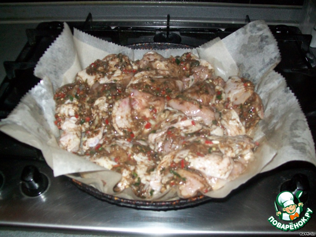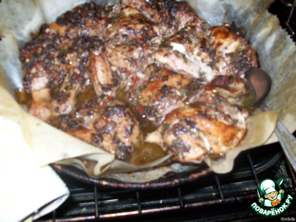 Разогреть духовку до 200 гр. Форму застелить бумагой или фольгой, выложить курицу, здесь два варианта: очистить курицу от специй или класть вместе с ними. Со специями получится ну "совсем по-ямайски". :)