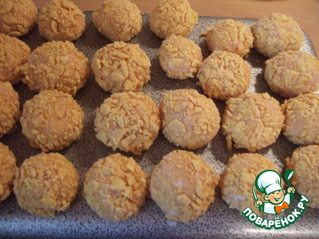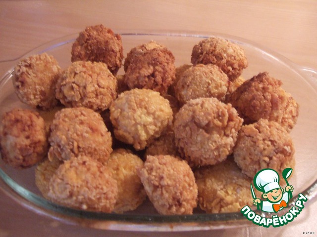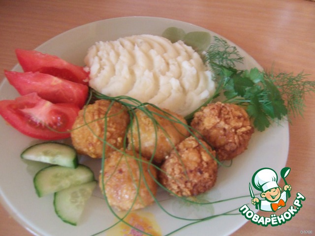 | (рецепт от повара тети Любы) Очень сочные куриные шарики. Этот рецепт у нас уже давно и получили мы его от повара тети Любы (мясо по-французски тоже еe). Поискала на сайте, вроде нет такого. На обсыпку использовала новшество Натальи (xsenia) - кукурузные хлопья. Получилось очень вкусно. Попробуйте :-) |