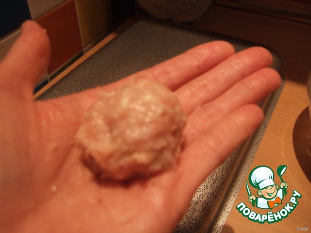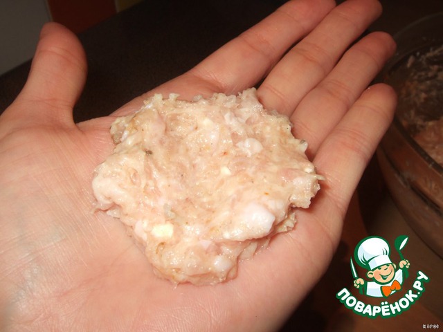 Фарш очень вязкий, поэтому приготовьте рядом чашечку с водой для смачивания руки;