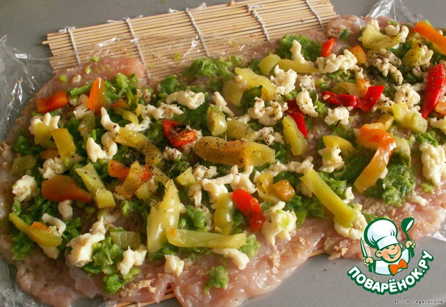 Куриное филе отбить. Выложить на пленку внахлест. Очень пригодился коврик для суши.