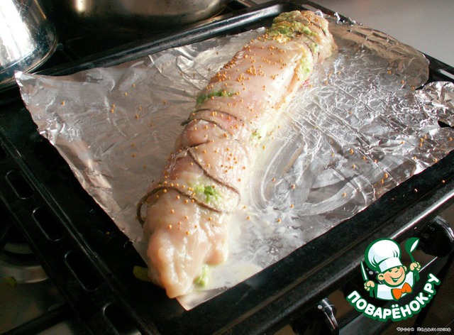 Аккуратно свернуть рулет, перевязать мокрыми нитками, посыпать зернами горчицы.