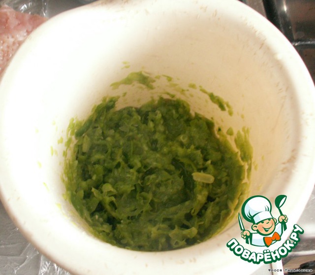 В горчицу выдавить чеснок, намазать эту смесь на куриное филе, посолить.