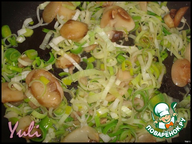 На другой сковороде растопить сливочное масло и обжарить порей 3 мин.Добавить грибы,нарезанные пластинами и жарить ещё 2 мин.Если грибы замороженные, время следует увеличить.