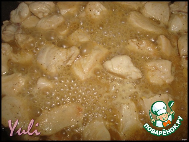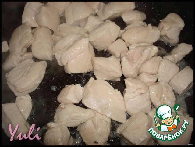 Разогреть 1 ст.л. растительного масла и обжарить куриное филе,помешивая,до готовности(10 мин).