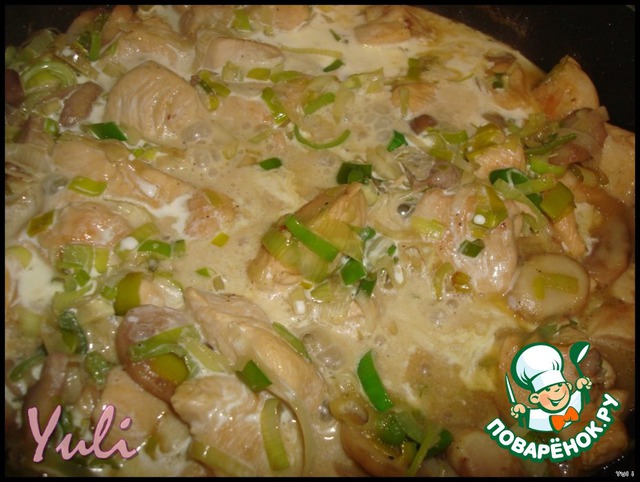 | Очень нежные, чуть острые кусочки курицы с шампиньонами, горчицей, пореем и сливками - это изумительно просто и вкусно! Готовила эту курочку два дня подряд - понравилась нам безумно! |