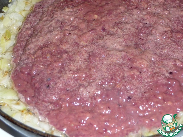 Пока мясо отдыхает, готовим печень. Печень помыть, почистить, перекрутить через мясорубку. Лук порезать кубиками и обжарить на растительном масле (берем от общего объема масла, не повредит и на топленом), до золотистого цвета.