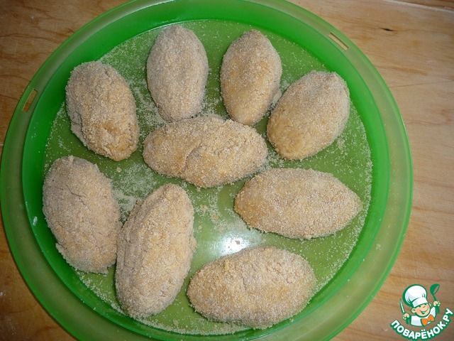 Для панировки взять тарелку с мукой, вторая тарелка -яйца взбить, добавить молоко, третья тарелка с панировочными сухарями (все сухари сразу не высыпать, лучше подсыпать частями по мере необходимости).