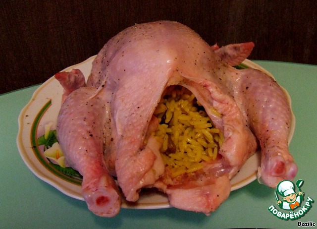 4. "Фаршируем" птицу рисом, добавляя дольки мандарина и лимона. Умеренное кол-во лимона придаст изысканную кислинку, а чрезмерное его кол-во, к сожалению, горькость.