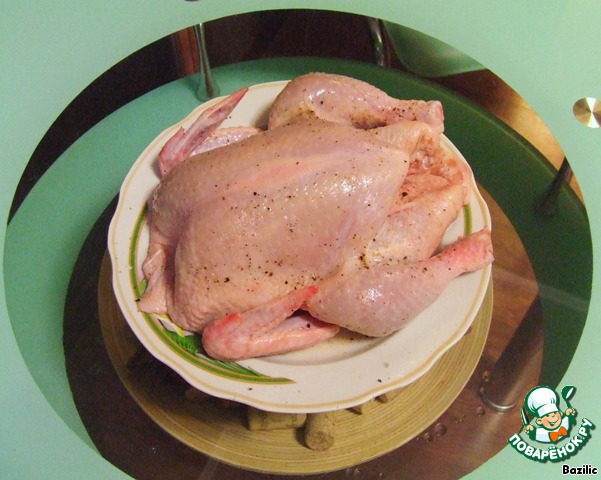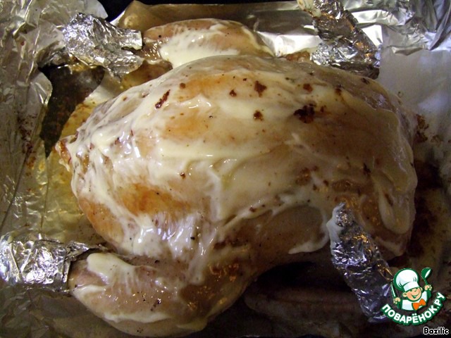 6. Запекаем курицу в духовке при температуре 170-200 град. на протяжении часа. Примерно за 5-10 мин. до готовности птицы смазываем ее поверхность майонезом и поливаем выделившимся при жарке соком для образования золотистой корочки.