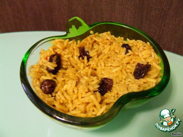2. Рис помещаем в глубокую кастрюлю, добавляем изюм и заливаем водой в соотношении 1:1. Также добавляем соль и специи по вкусу (можно использовать смесь готовых пряностей "для плова").