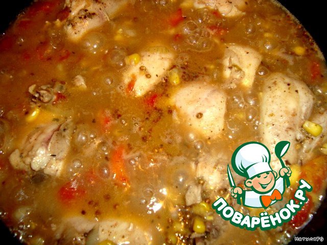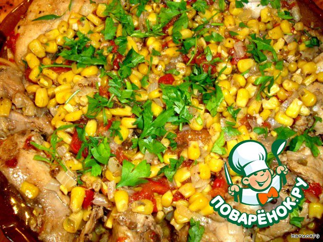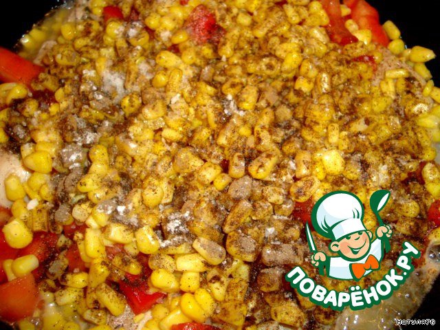 Затем переворачиваем и выкладываем в сковороду помидоры, лук, кукурузу. Выливаем оставшийся маринад, посыпаем сверху перчиком. Теперь нужно посолить и накрыть крышкой.