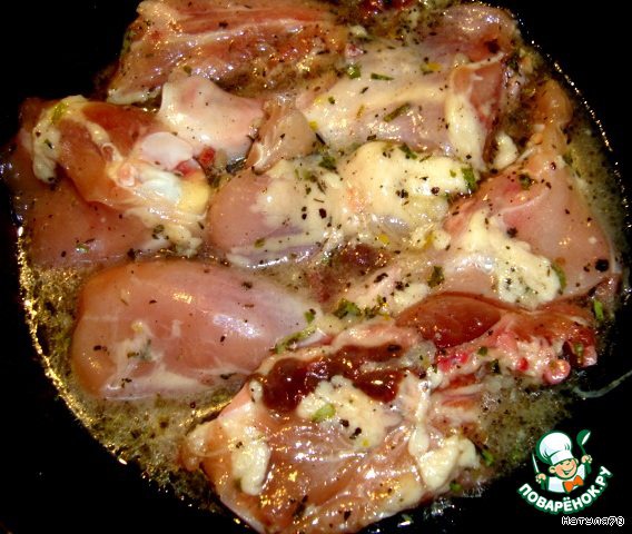 Окорочка освобождаем от кожи, срезаем жир, нарезаем на кусочки и кладем в маринад на пол-часа.