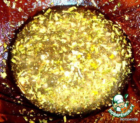 Готовим маринад. В глубокую посуду выливаем вино, 50 мл масла, выдавливаем чеснок, солим, перчим и добавляем базилик, эстрагон и кориандр.