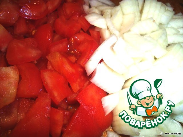 Помидоры ошпариваем кипятком, снимаем кожицу, нарезаем крупными кусочками. Лук также нарезаем крупно.