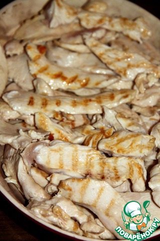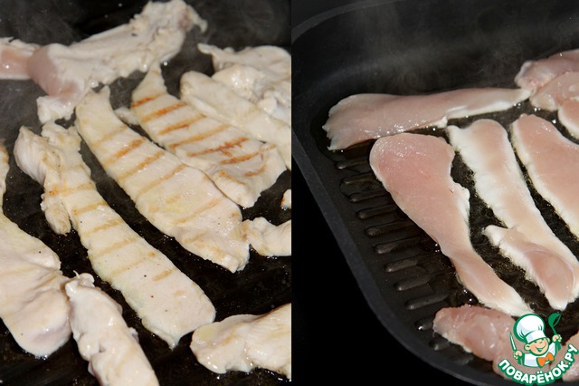 Грудку мы нарежем небольшими полосками и обжарим на горячей сковороде-гриль с небольшим добавлением оливкового масла. Если у Вас нет такой сковороды, не расстраивайтесь, вы можете приготовить курочку на обычной сковороде.