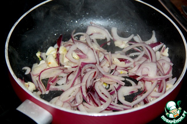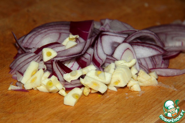 Лук нарежем полукольцами, мелко нашинкуем чеснок.