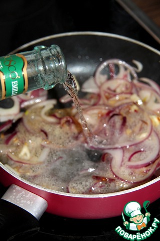 Добавим соевый соус, немного потушим и добавим шампанское. Я использовала легкое белое полусладкое Lambrusco.