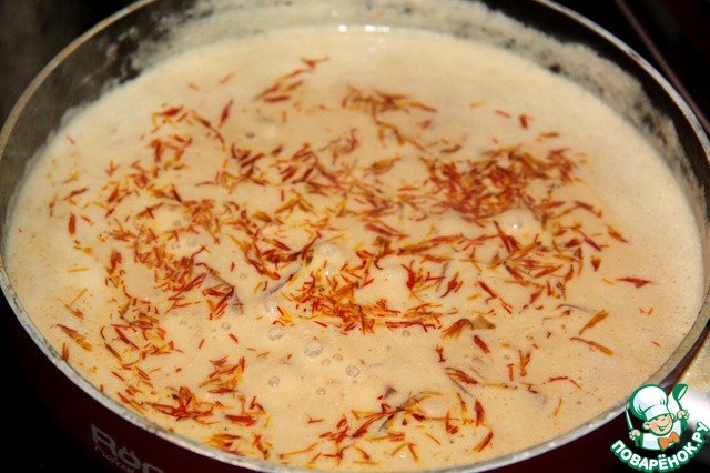 Немного потушим, введем сливки и последний штрих – шафран.