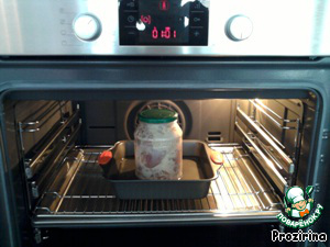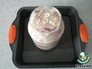 Сложить в сухую литровую банку и прикрыть (не закручивая) металлической или стеклянной крышкой. Банку ставим в лоток с холодной водой, налитой примерно на 1 см. Во время приготовления жир может вытекать из банки, а попадая в воду он не будет гореть.