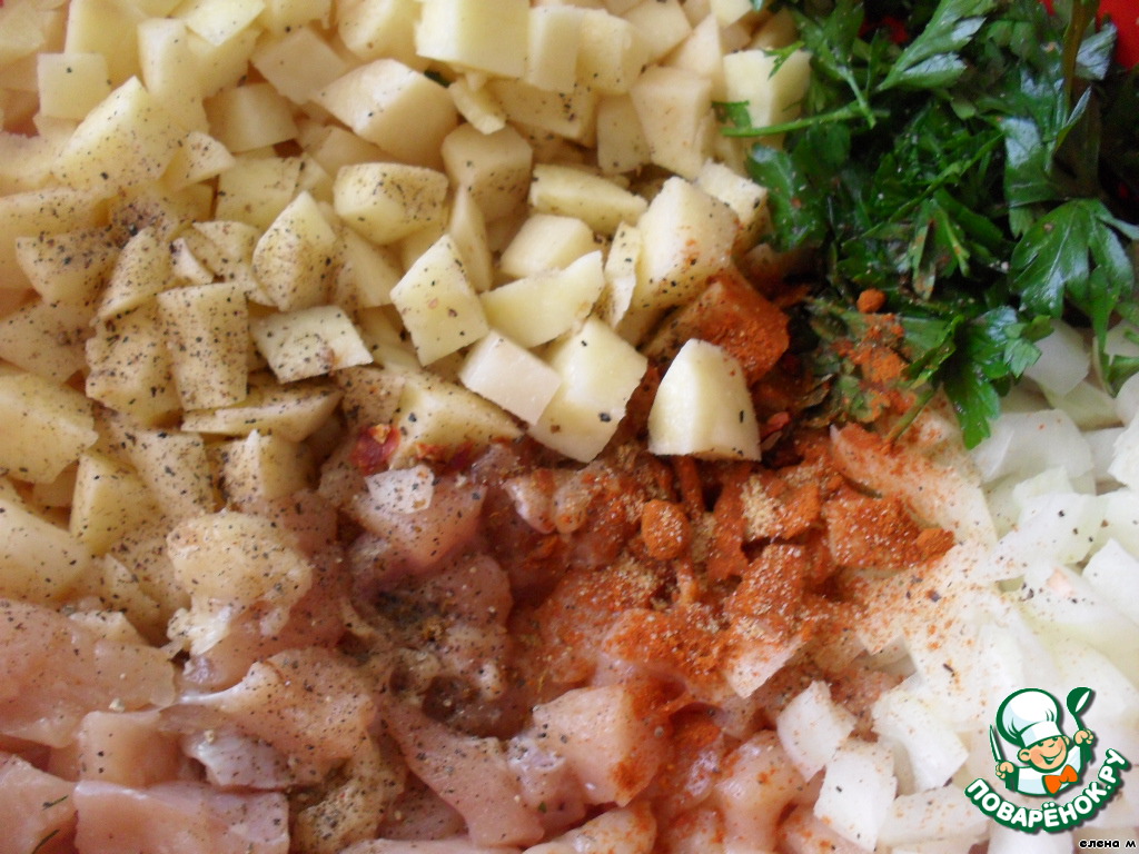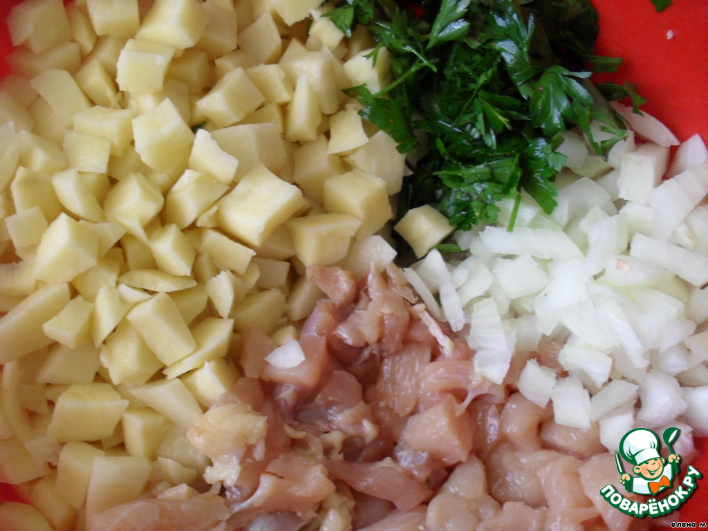 Куриное филе, очищенные лук и картофель нарезаем кубиками.