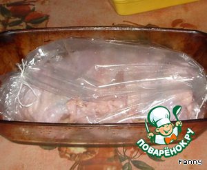 Посолить рулет, заложить его в рукав для запекания и поставить в духовку запекаться на 50 -60 минут при температуре 200 *.