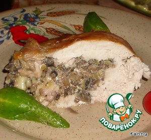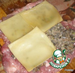 Выложить грибную массу на куриное филе. Покрыть сверху пластинками сыра.