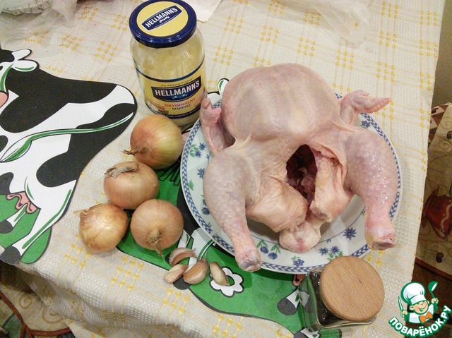 Итак, начнём. Немного комментариев относительно ингредиентов. Для рецепта нам понадобится, собственно, курица, или вернее цыплёнок бройлер весом примерно 2 кило. Цифры приведены именно для такого цыплёнка.