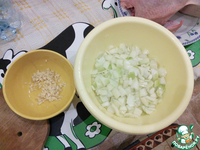 Лук нарезаем крупными кубиками. Я ещё его расслаиваю, чтобы получились пластинки, если сам не разваливается. "Правильными" кусочками я считаю пластинки лука из одного слоя, с поверхностью примерно 1 кв. см. Но, естественно, линейкой измерять не надо, тут уж как получится :-) Главное - не резать слишком мелко. Чеснок давим плоскостью ножа и режем как можно мельче. Можно и с помощью специальной давилки чеснока, но тогда лучше давить сразу в майонез, чтобы ни капли сока не потерять.