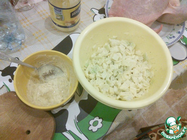 В лук добавляем 2-3 столовых ложки майонеза, чёрный перец по вкусу, чайную ложку соли без горки. В чеснок добавляем 2 столовых ложки майонеза, чёрный перец по вкусу, чайную ложку соли без горки. Размешиваем.