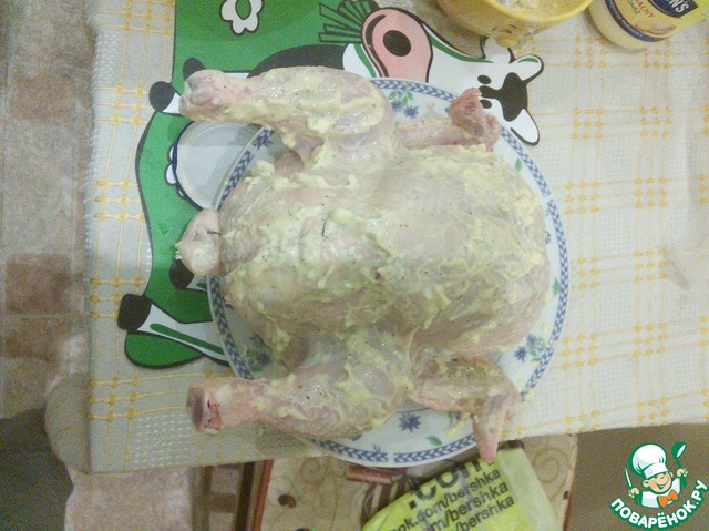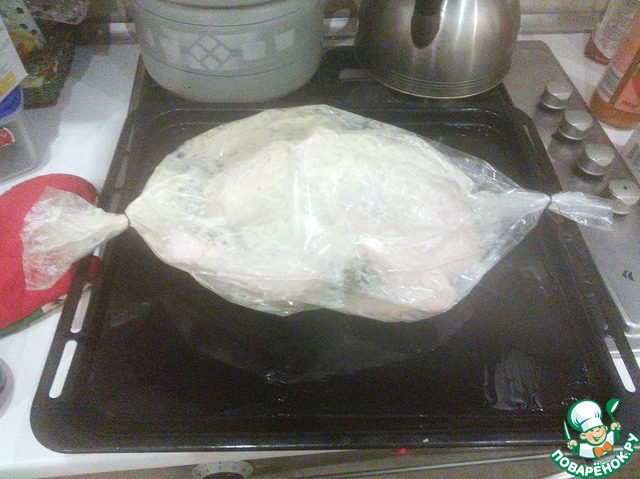Раскаляем духовку до максимума (потом убавим). Суём курицу в мешок для выпечки, завязываем с двух сторон. Желательно соблюсти несколько моментов: оставить с каждой стороны сантиметров по пять свободного пространства; оставить внутри мешка как можно меньше воздуха; связать крепко, но при этом оставив возможность излишкам воздуха выйти, не повредив мешок. Смазываем противень небольшим количеством масла - в случае, если мешок не очень качественный - это может сохранить его, даже если и немного расплавится, то не пригорит. Ставим всё это дело в центр духовки, уменьшаем температуру до 180 градусов, и оставляем на 1 час и 30 минут.