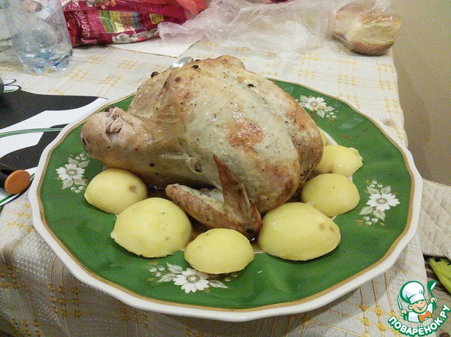 Да, кстати, если у вас нет идей для гарнира, то пока готовится курица, можно приготовить к ней картошку. Начать этим заниматься можно примерно через 40-45 минут, после того, как курица была отправлена в духовку. Отварите несколько картошин до полуготовности (не забудьте посолить). Разрежьте каждую пополам вдоль, и обложите половинками мешок с курицей примерно через час, после того, как курица отправлена в духовку. То есть - за пол часа до готовности. Как есть кладите, больше ничего не надо. К моменту готовности картошка уже успеет пропечься, но ещё не успеет пригореть.